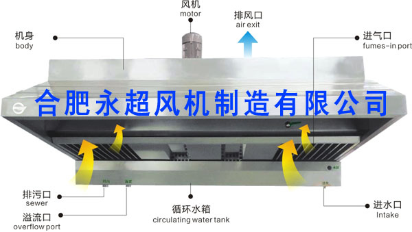 4、流回到水淋式油烟净化器的净化箱内的油水混合物和其它杂质,采用多层隔拦式处理后的水返回喷淋室将被循环使用。